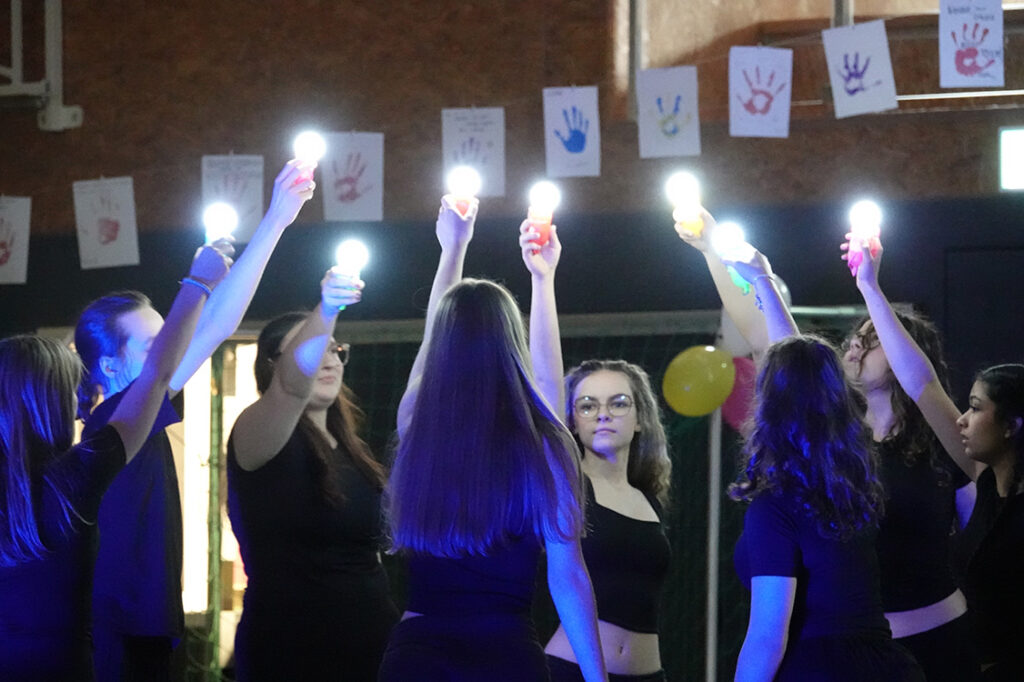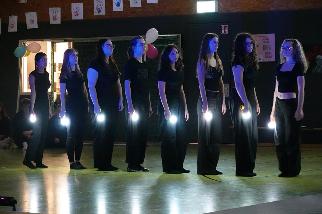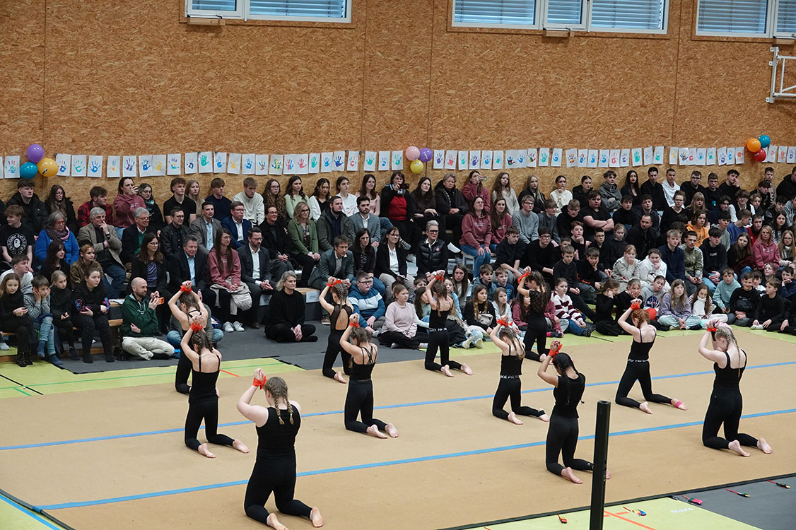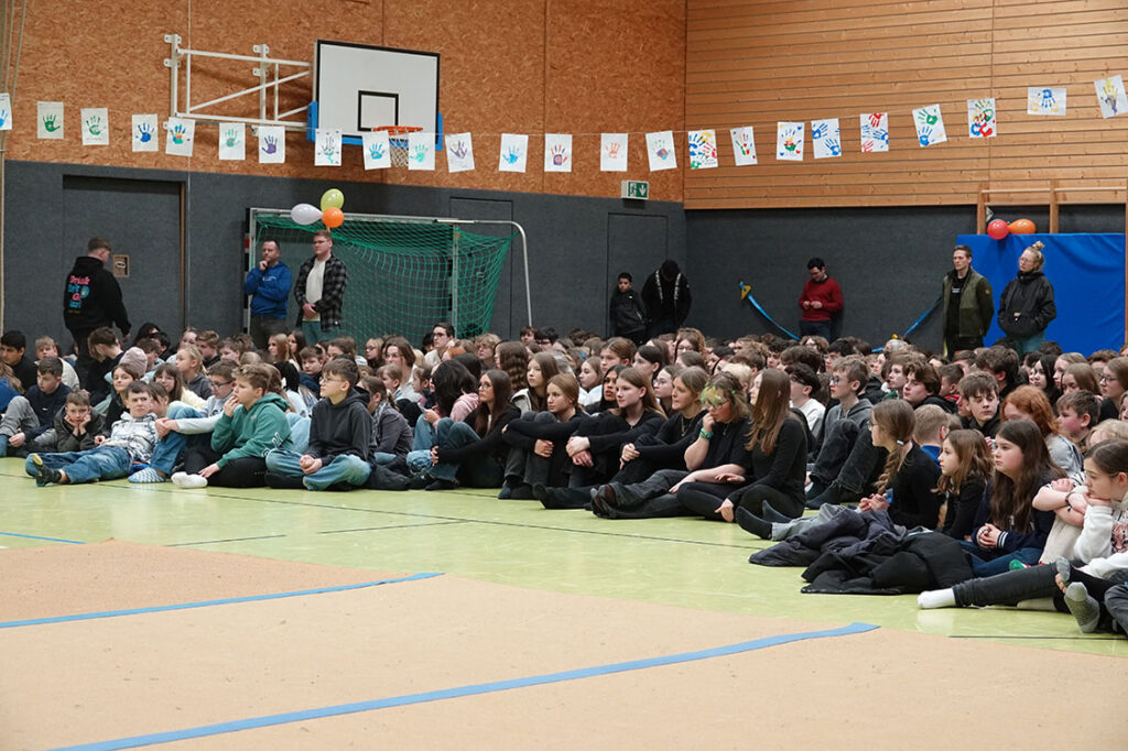 Die Inszenierung des Kurses Darstellendes Spiel unter der Leitung von Yannik Gorka-Wenzel als Schattenspiel zog die volle Aufmerksamkeit der Halle auf sich. Auch die Beiträge aus Modern Dance (Zana Kastrati) und der Turn-AG (Leitung: Christiane Stelling) überzeugten durch Ausdruck, Dynamik und klare Bezüge zum Motto der Veranstaltung. Ein weiterer besonderer Moment war der Videobeitrag der AG Schule ohne Rassismus, der viele Stimmen aus der Schulgemeinde, bereits bestehende Aktivitäten und persönliche Statements vereinte – ein sichtbares Zeichen dafür, dass dieses Engagement bereits begonnen hat.