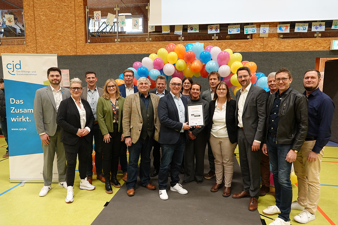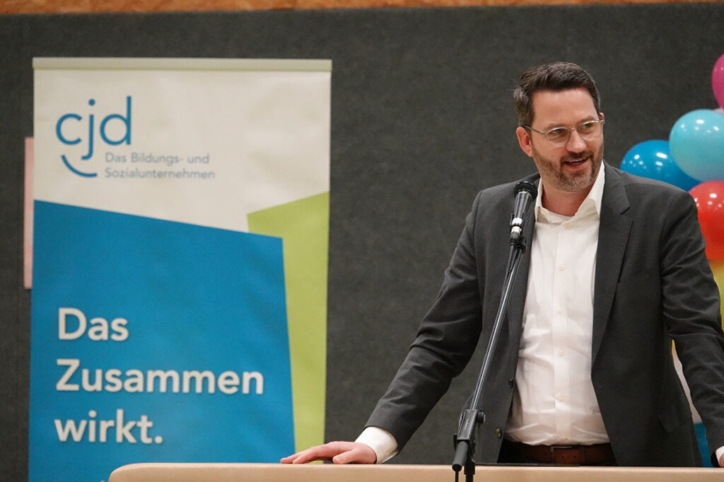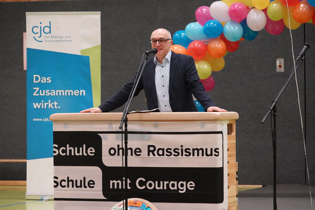 Es folgte die Rede von Oliver Stier, Sprecher des CJD-Vorstands. Auch er machte deutlich, dass die Auszeichnung kein einmaliger Akt sei, sondern täglich mit Leben gefüllt werden müsse. Gleichzeitig brachte er die Wertschätzung des Schulträgers zum Ausdruck und zeigte sich stolz auf eine Schule, die diese Haltung sichtbar lebt.