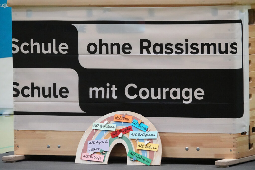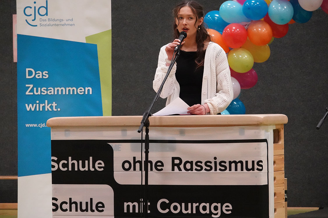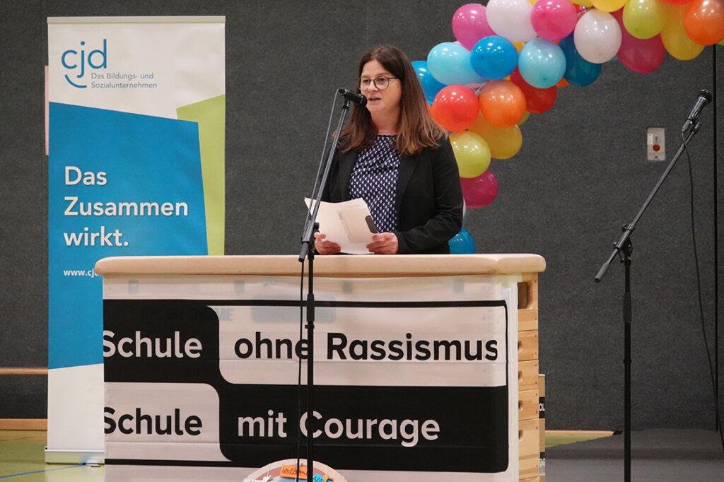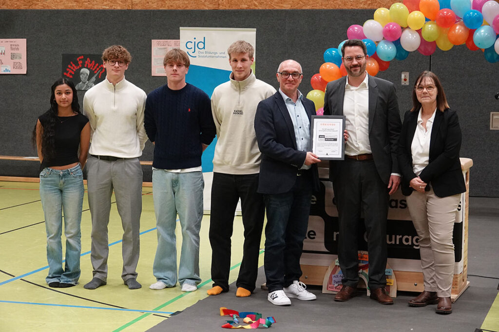 Die offizielle Titelverleihung „Schule ohne Rassismus – Schule mit Courage“ konnte wetterbedingt nicht persönlich durch Ahmet Selcuk Özkan erfolgen. Stattdessen übernahm Petra Densborn vom CJD-Vorstand diesen feierlichen Akt, ergänzt durch eine Videobotschaft des Landeskoordinators.