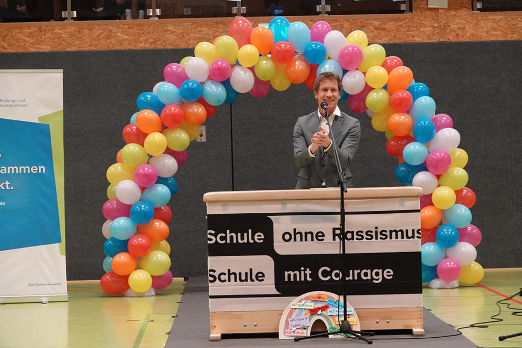 Im Anschluss begrüßte Schulleiter Christoph Heimbucher die Schulgemeinde sowie die zahlreichen Ehrengäste. In seiner Rede machte er deutlich, dass der Titel „Schule ohne Rassismus – Schule mit Courage“ kein bloßes Label sei, sondern eine bewusste Entscheidung, die mit Verpflichtung verbunden ist. Es gehe darum, Haltung zu zeigen, nicht wegzusehen und im Alltag mutig einzustehen – für Menschenwürde, Demokratie und Respekt. Gerade im Gedenken an Hanau sei dieser Schritt von besonderer Bedeutung. Zugleich betonte er die christlichen Werte, die unsere Schule als Teil des Christliches Jugenddorfwerk Deutschlands prägen und die heute aktueller sind denn je.