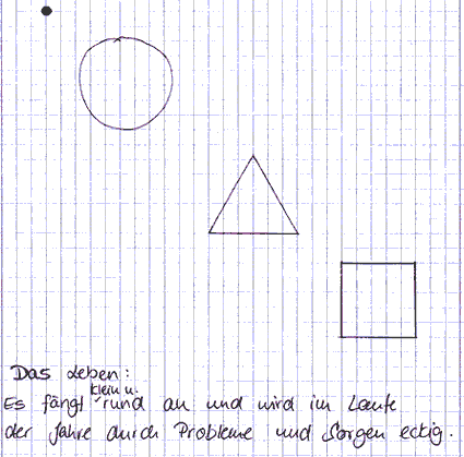 Das reicht vom „Nur-Zeichnen“ bis zum Beispiel hierzu… Das Leben: Es fängt klein und rund an (Punkt/Kreis) und wird im Laufe der Jahre durch Probleme und Sorgen eckig (Dreieck/Quadrat). Das stammt nicht etwa vom chinesischen Weisen Laotse, sondern von Katharina (Realschule Jahrgang 9)!