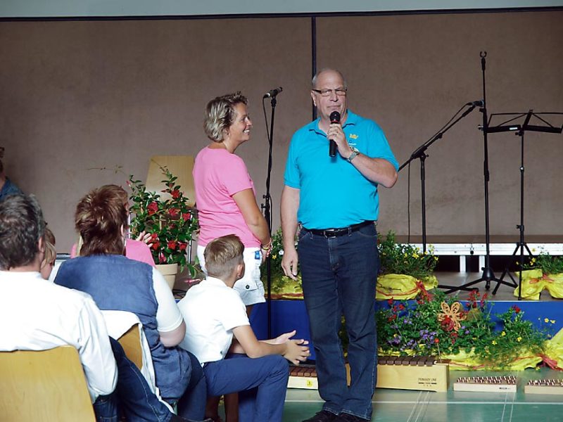 Schulleiter Winfried Heger stellte auf unterhaltsame Weise die Damen des Sekretariats vor, im Bild Simone Aue. Das „Entertainment“ des Chefs war aber kein Selbstzweck, sondern half – offensichtlich erfolgreich – den neuen Schülern das mulmige Gefühl dem Neuen und Unbekannten gegenüber ,das da auf sie zukommt, zu harmonisieren. Auch die ernsten Gesichter überzog schließlich ein Lächeln.