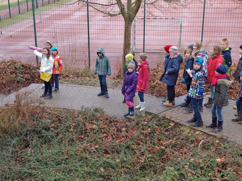 Da geht es zur Schulbushaltestelle! Unsere Fünfklässler kennen sich immerhin schon ein halbes Schuljahr und damit gut aus. Man achte auf den respektvoll-skeptischen Abstand der jungen Gäste!