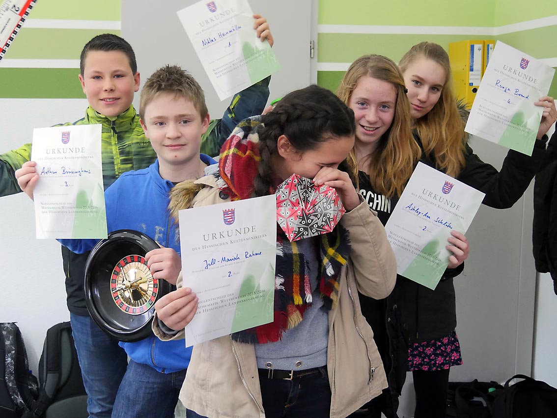 Die erste Runde des hessenweiten Mathematikwettbewerbs der Jahrgangsstufe acht (Realschule und Gymnasium) kurz vor den Weihnachtsferien, an dem alle Schüler obligatorisch teilnehmen müssen, sorgt oft schon in der siebten Klasse für allgemeine Aufregung – wegen der Aussicht im schlimmsten Fall (einem „schlechten“ Notendurchschnitt), nicht auf eine Wiederholung hoffen zu können. Auch 2015 stellte sich dann aber heraus, dass es doch ganz gut lief. Letzten Donnerstag wurden die Besten des Jahrgangs 2015-16 von Schulleiter Günter Koch geehrt.
