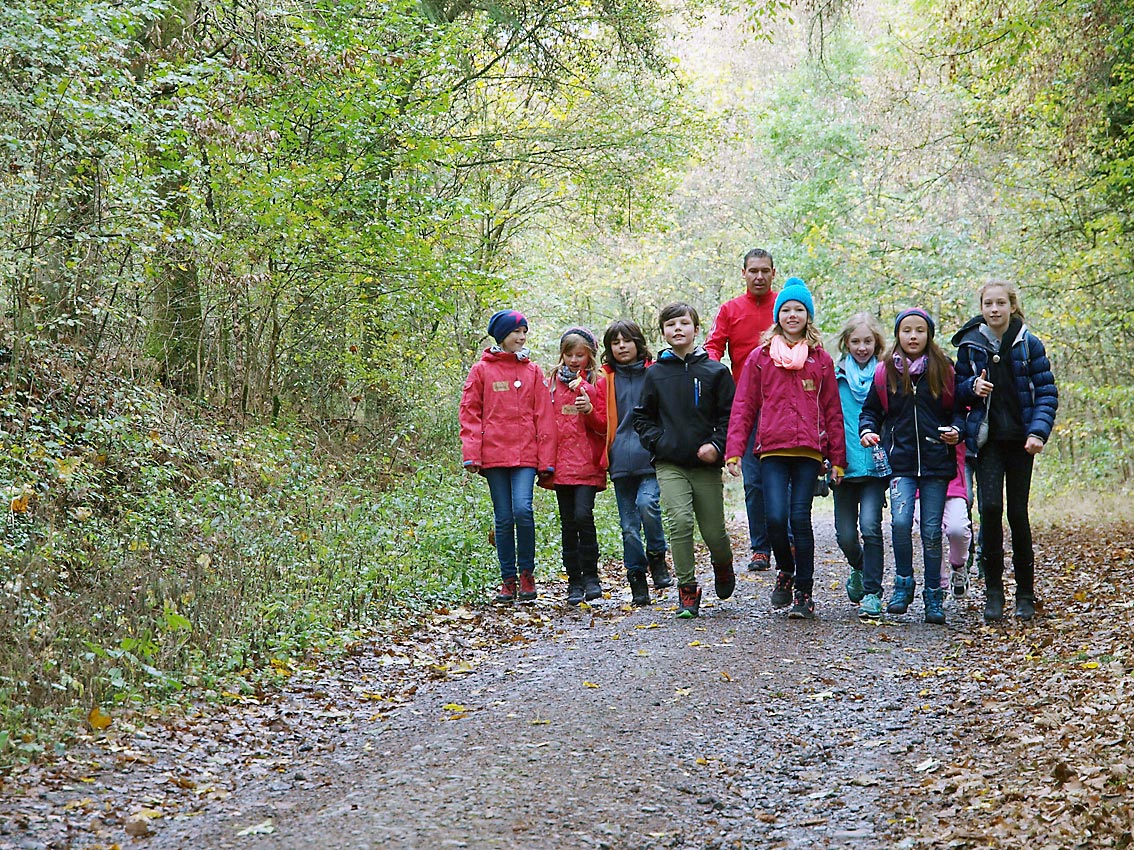 Aus dem Wald tönen helle Kinderstimmen. Also mal dem Gehör folgen. Und siehe da: ein Teil der 5b, in Begleitung unseres Schulsozialarbeiters Michael Schneider, taucht auf dem Waldweg zwischen herbstbunten Bäumen auf. „Die 5a von Frau Lechner ist da oben,“ Michael Schneider zeigt in den dichten Wald hinter sich. Nur wenige Schritte und lautes Jubelgeschrei ist unüberhörbar. Die 5a hat gerade Baumhütten gebaut, dann Holz gesammelt und ist jetzt auf dem Weg zur Feuerstelle neben der Jugendburg. Der unerwartete Besucher von „daheim“ verleitet die Kinder dazu, den Jubel nochmal zu steigern.