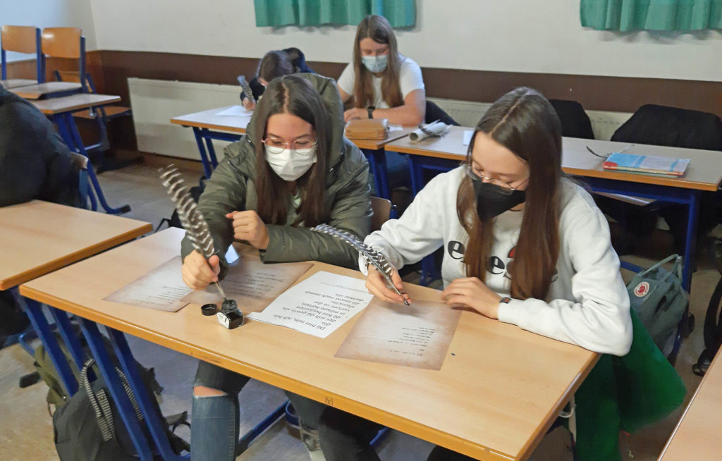 Zum Ende des ersten Halbjahres haben wir, die Klasse 8d, im Geschichtsunterricht bei Frau Willius-Herbold Kalligrafie ausprobiert. Kalligrafie ist die Kunst des schönen Schreibens, welche Mönche oder auch Nonnen früher ausgeübt haben. Sie saßen dabei dann in einem Skriptorium. Ein Skriptorium gab es meist in jedem Kloster im Mittelalter und wird auch Schreibstube genannt. Wir konnten im Unterricht selbst merken, dass es sehr schwer ist, so zu schreiben, da man damals auch mit Feder bzw. Federkiel und Tinte schreiben musste. Zwar haben wir nicht so wie früher auf Tierhaut geschrieben, aber auf verziertem Papier, welches etwas edler und auch älter aussah. Doch zum Üben nutzten wir zunächst natürlich gab es auch Schmierpapier zum Üben. Als die Schüler fertig geübt hatten, durften sie auf das „edle“ Papier ein altes Gedicht aufschreiben, entweder in sehr schöner Schrift, also mit Schnörkeln oder in normaler Druckschrift, aber natürlich schön.