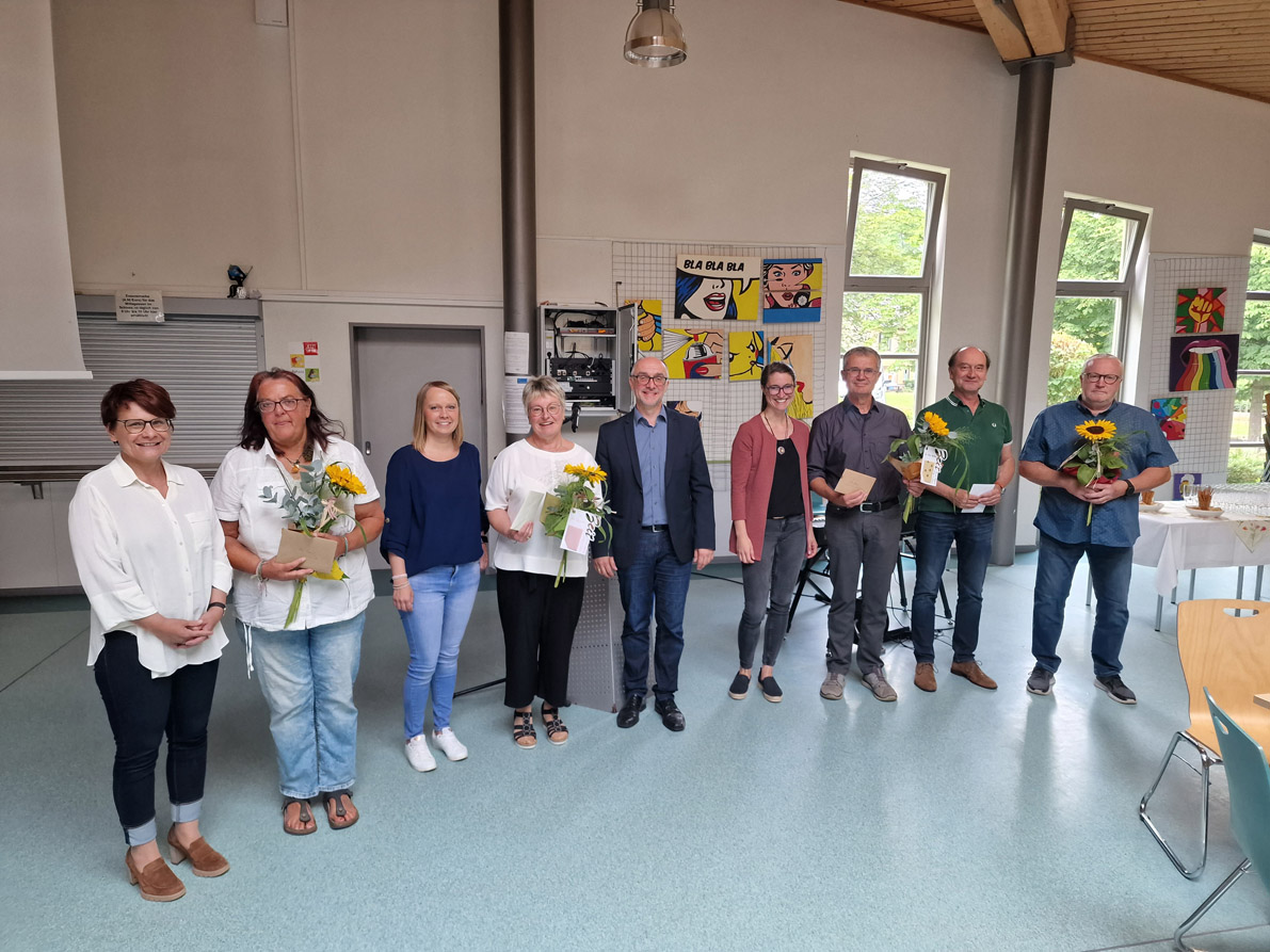 Offizielle Verabschiedung durch die Schulleitung. V.l. Andrea Böttcher, Cornelia Lammert-Eichenberg, Miriam Jüngel, Christine Schäfer, Schulleiter Christoph Heimbucher, Julia Krug, Hans Walther Reeh, Manfred Schreiber und Uwe Malkus. Foto: T. Fleck/CJD Oberurff
